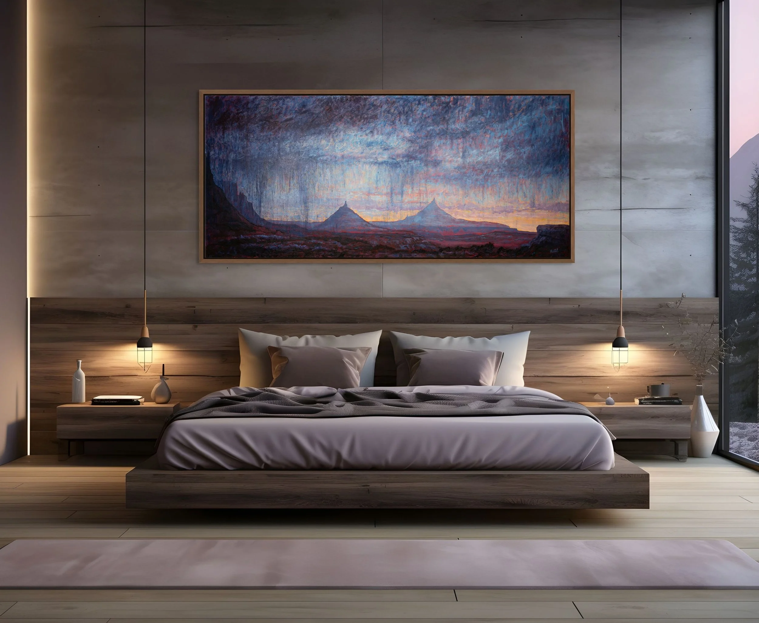 "Amidst the Storm" draws inspiration from a visit to the Needles District in Canyonlands National Park. During my trip, afternoon rainstorms often rolled across the rugged landscape. One evening, as a powerful storm approached, I decided to venture ahead of the storm to photograph the unfolding drama. Positioned outside the park near Six Shooter Peak, I watched as the storm unleashed a curtain of rain over the valley beneath a dramatic, fiery sunset. The sky was a mesmerizing blend of dark blue and purple clouds, illuminated by a vivid orange glow, creating a surreal and awe-inspiring scene. The breathtaking intensity of the moment compelled me to capture it on canvas.